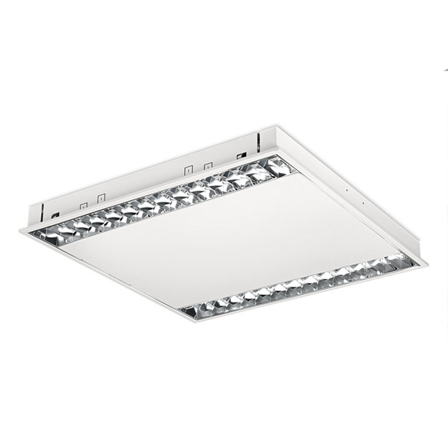 Geschikt voor systeemplafonds, moduul 600, met zichtbare profielen. Voor systeemplafonds met onzichtbare profielen kan een set montagebeugels worden geleverd. Wit gemoffeld plaatstaal. Inclusief geïntegreerde led, standaard in 3000K en 4000K, een PMMA diffuser en Wieland chassisdeel GST 18i3 (bij dimbare uitvoering GST 18i5).