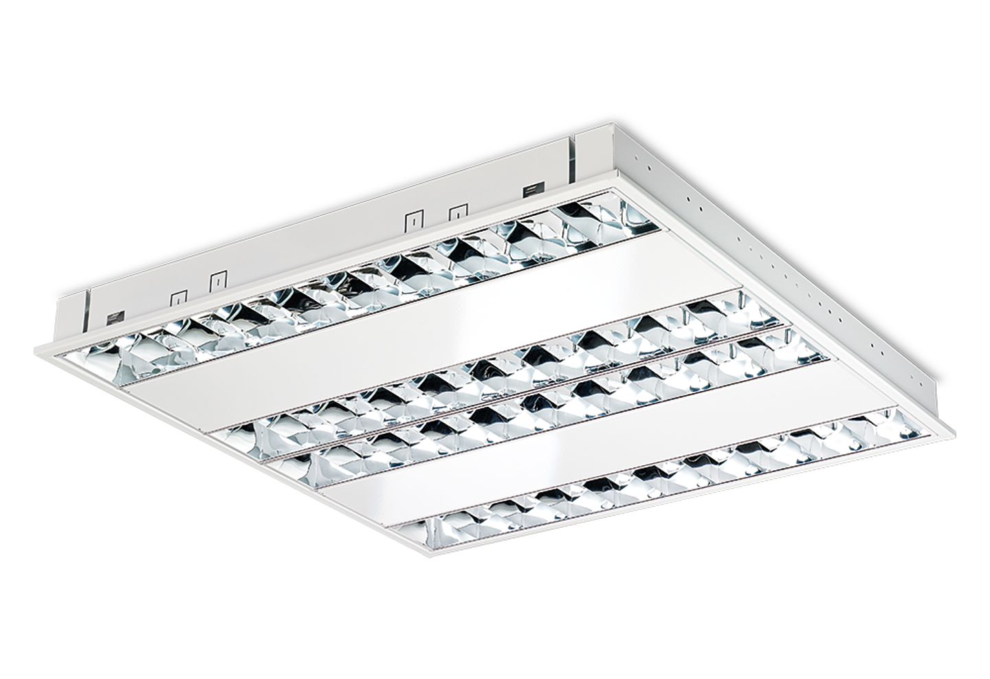 Geschikt voor systeemplafonds, moduul 600, met zichtbare profielen. Voor systeemplafonds met onzichtbare profielen kan een set montagebeugels worden geleverd. Wit gemoffeld plaatstaal. Inclusief geïntegreerde led, standaard in 3000K en 4000K, een PMMA diffuser en Wieland chassisdeel GST 18i3 (bij dimbare uitvoering GST 18i5).